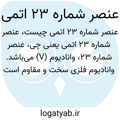 عنصر شماره ۲۳، وانادیوم (V) میباشد. وانادیوم فلزی سخت و مقاوم است که در آلیاژهای فلزی برای افزایش استحکام و مقاومت در برابر خوردگی به کار میرود. همچنین در ساخت فولادهای پر مقاومت استفاده میشود.