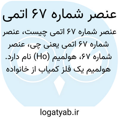 عنصر شماره ۶۷، هولمیم (Ho) نام دارد. هولمیم یک فلز کمیاب از خانواده لانتانیدهاست که به دلیل خواص مغناطیسی خاص در برخی تجهیزات فناوری و پزشکی کاربرد دارد.