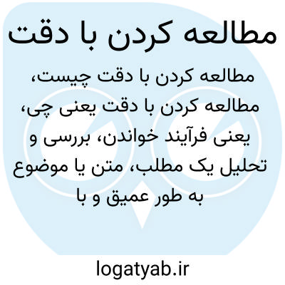 یعنی فرآیند خواندن، بررسی و تحلیل یک مطلب، متن یا موضوع به طور عمیق و با توجه به جزئیات؛ مطالعه دقیق به هدف فهم کامل و به دست آوردن اطلاعات جامع انجام میشود.