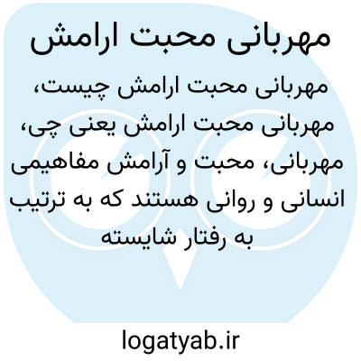 مهربانی، محبت و آرامش مفاهیمی انسانی و روانی هستند که به ترتیب به رفتار شایسته و با محبت نسبت به دیگران، ابراز عشق و علاقه و حالتی از آرامش ذهنی و جسمی اشاره دارند. ترکیب این سه واژه بیانگر روحیه‌ای دوستانه و صلح‌آمیز است که زمینه‌ساز روابط انسانی سالم و مثبت است.