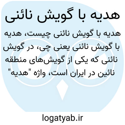 در گویش نائنی که یکی از گویشهای منطقه نائین در ایران است، واژه "هدیه" ممکن است به صورت خاصی بیان شود یا اصطلاحی محلی برای آن وجود داشته باشد. "هدیه" کلمهای فارسی به معنای بخشش یا چیزی است که بدون انتظار جبران به کسی داده شود. گویشهای محلی ممکن است لهجه یا واژه متفاوتی برای این مفهوم داشته باشند که نشاندهنده فرهنگ و آداب منطقه است.