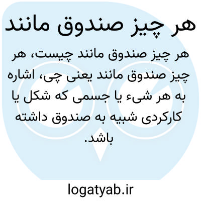 اشاره به هر شیء یا جسمی که شکل یا کارکردی شبیه به صندوق داشته باشد. صندوق معمولاً جعبه‌ای است برای نگهداری و حفاظت از اشیاء یا اسناد ارزشمند. این عبارت می‌تواند به هر جعبه، کمد، یا محفظه‌ای اشاره کند که به صورت صندوق طراحی شده یا کاربرد مشابه دارد.