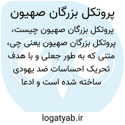 متنی که به طور جعلی و با هدف تحریک احساسات ضد یهودی ساخته شده است و ادعا می‌کند که سندی محرمانه توسط رهبران یهودی است که برای تسلط بر جهان برنامه‌ریزی کرده‌اند؛ این پروتکل به عنوان یک سند ساختگی و ضد یهودی به شدت محکوم شده است.