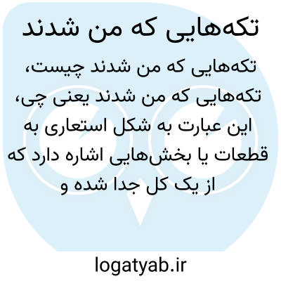 این عبارت به شکل استعاری به قطعات یا بخش‌هایی اشاره دارد که از یک کل جدا شده و هر بخش نمایانگر بخشی از وجود یا شخصیت یک فرد است. ممکن است در متون ادبی و فلسفی برای توصیف تجربیات پراکنده یا جنبه‌های مختلف یک انسان به کار رود.
