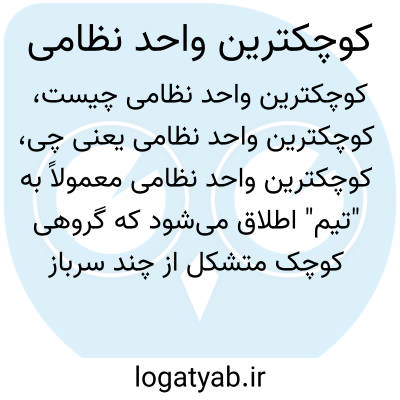 کوچکترین واحد نظامی معمولاً به "تیم" اطلاق میشود که گروهی کوچک متشکل از چند سرباز است و در ساختار نظامی برای انجام وظایف خاص سازماندهی میشود. این واحد کوچکترین واحد عملیاتی در ساختار ارتشهاست.