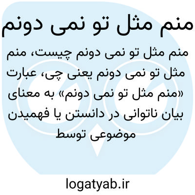عبارت «منم مثل تو نمی دونم» به معنای بیان ناتوانی در دانستن یا فهمیدن موضوعی توسط گوینده است و معمولاً در گفتگوها وقتی کسی نمیتواند جواب مشخصی بدهد یا اطلاعاتی ندارد، به صورت خودمانی گفته میشود.