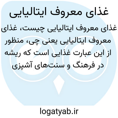 منظور از این عبارت غذایی است که ریشه در فرهنگ و سنت‌های آشپزی ایتالیا دارد و در سراسر جهان شناخته شده است. از جمله غذاهای معروف ایتالیایی می‌توان به پیتزا، پاستا، لازانیا و ریزوتو اشاره کرد که هر کدام با مواد خاص و روش پخت ویژه‌ای تهیه می‌شوند و طعمی منحصر به فرد دارند.