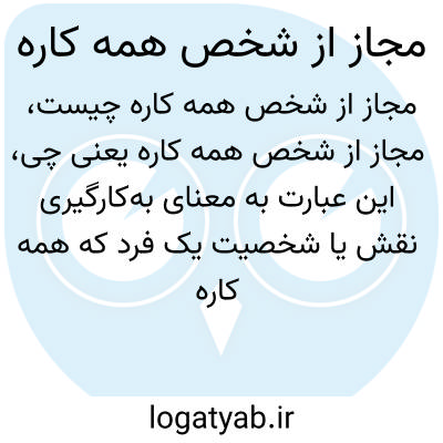 این عبارت به معنای به‌کارگیری نقش یا شخصیت یک فرد که همه کاره بوده و مسئولیت‌های زیادی بر عهده داشته است به صورت مجازی است. به عبارت دیگر، وقتی گفته می‌شود «مجاز از شخص همه کاره»، منظور استفاده کنایی از یک فرد با نفوذ، قدرتمند یا دارای مسئولیت‌های گسترده است.