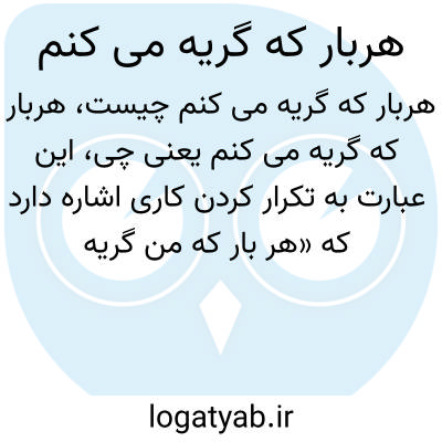 این عبارت به تکرار کردن کاری اشاره دارد که «هر بار که من گریه میکنم» اتفاق میافتد. میتواند نشانگر حالت تکراری احساس غم، رنج یا احساساتی باشد که فرد در موقعیتهای مختلف تجربه میکند و از حس دلهره یا دلتنگی حکایت داشته باشد.