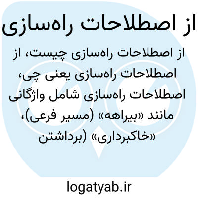 اصطلاحات راهسازی شامل واژگانی مانند «بیراهه» (مسیر فرعی)، «خاکبرداری» (برداشتن خاک از مسیر راه)، «روکش آسفالت» (لایه نهایی راه)، و «پایهگذاری» (شروع ساخت راه) میشود که برای توصیف فرایند ساخت و نگهداری جادهها کاربرد دارند.