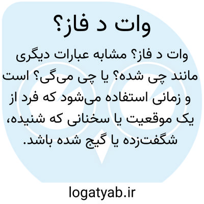 معنای کلی: وات د فاز؟ به معنای چی شده؟ یا چی میگی؟ است و هنگامی استفاده میشود که فرد از یک موقعیت یا سخنانی که شنیده، شگفتزده یا گیج شده باشد. این عبارت به نوعی نشاندهندهی عدم درک یا پذیرش یک موضوع خاص است و میتواند به احساسات متناقضی اشاره کند.