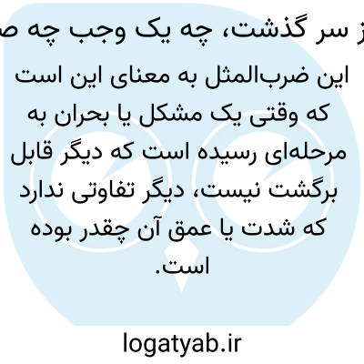 ضرب‌المثل «آب که از سر گذشت، چه یک وجب چه صد وجب» به معنای این است که وقتی یک مشکل یا بحران به مرحله‌ای رسیده است که دیگر قابل برگشت نیست، دیگر تفاوتی ندارد که شدت یا عمق آن چقدر بوده است. در واقع، این ضرب‌المثل به وضعیت‌هایی اشاره دارد که در آن‌ها فرد یا گروهی با یک مشکل بزرگ یا غیرقابل حل مواجه شده‌اند و دیگر نمی‌توانند از عواقب آن فرار کنند.