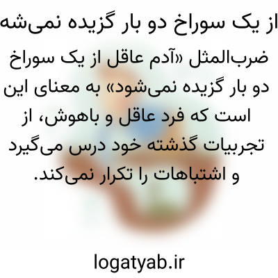 ضرب‌المثل «آدم عاقل از یک سوراخ دو بار گزیده نمی‌شود» به معنای این است که فرد عاقل و باهوش، از تجربیات گذشته خود درس می‌گیرد و اشتباهات را تکرار نمی‌کند. این عبارت به نوعی تأکید بر اهمیت یادگیری از تجربیات و عدم تکرار اشتباهات دارد.