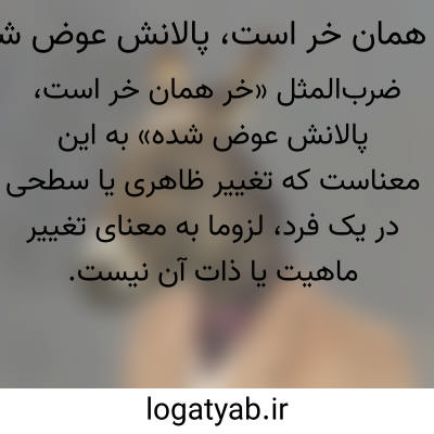ضربالمثل «خر همان خر است، پالانش عوض شده» به این معناست که تغییر ظاهری یا سطحی در یک فرد، لزوماً به معنای تغییر ماهیت یا ذات آن نیست. به عبارت دیگر، حتی اگر شرایط یا ظاهر یک شخص تغییر کند، ممکن است خود آن فرد همانطور که بوده باقی بماند و در واقع تغییر چندانی نکرده باشد.