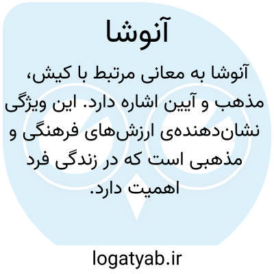 آنوشا به معانی مرتبط با کیش، مذهب و آیین اشاره دارد. این ویژگی نشان‌دهنده‌ی ارزش‌های فرهنگی و مذهبی است که در زندگی فرد اهمیت دارد. در این زمینه، این اسم می‌تواند نماد هویت فرهنگی و مذهبی باشد و به فرد احساسی از تعلق به یک جامعه و فرهنگ خاص بدهد.